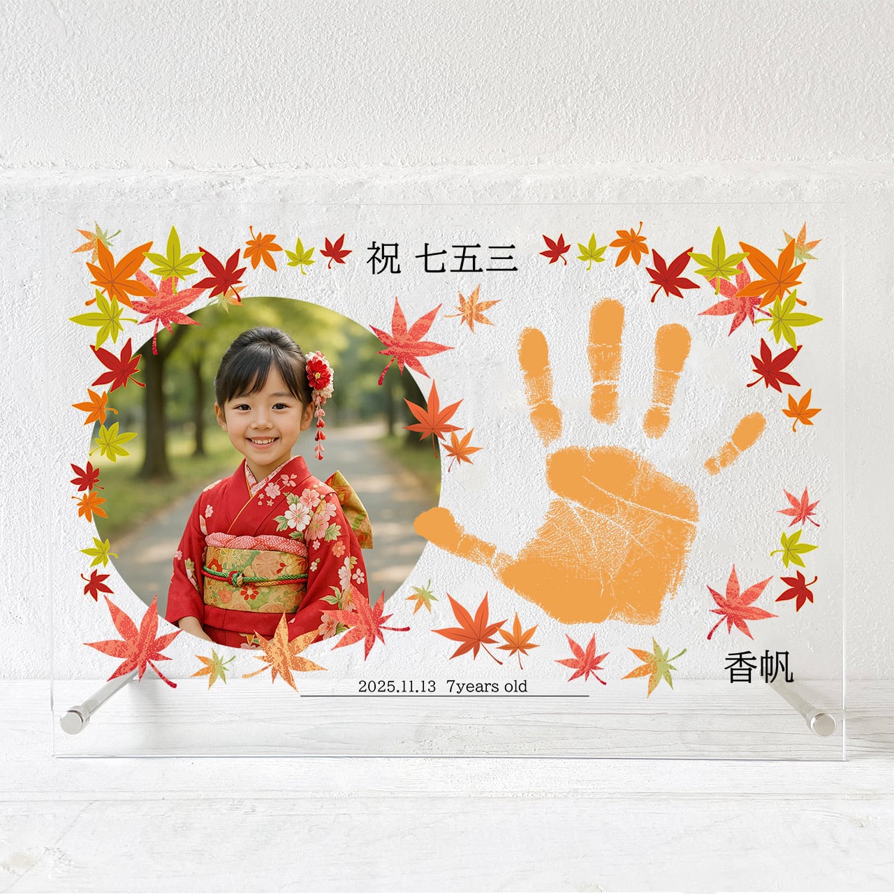〈STA401m〉【七五三の記念に】写真付!こども手形(背景色クリア)アクリルフォトスタンドA4 momiji(手形横幅13cm前後まで)
