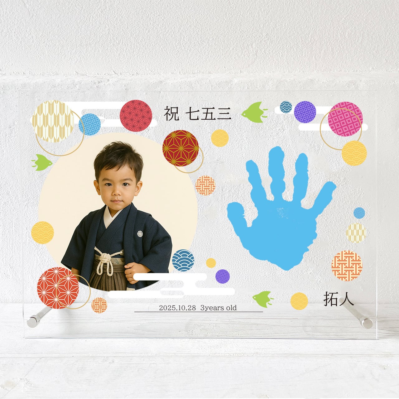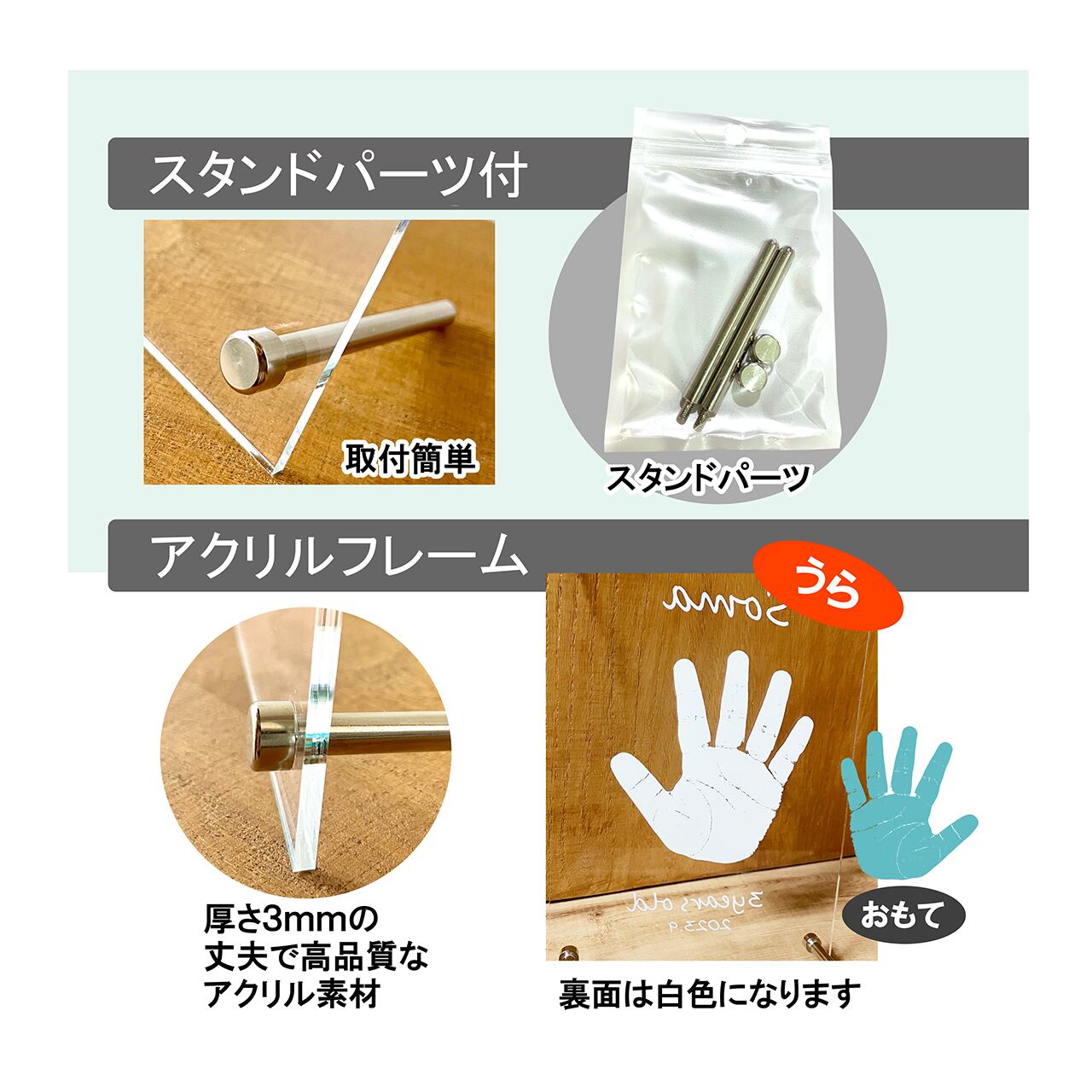〈STA401t〉【七五三の記念に】写真付!こども手形(背景色クリア)アクリルフォトスタンドA4 temari(手形横幅13cm前後まで)