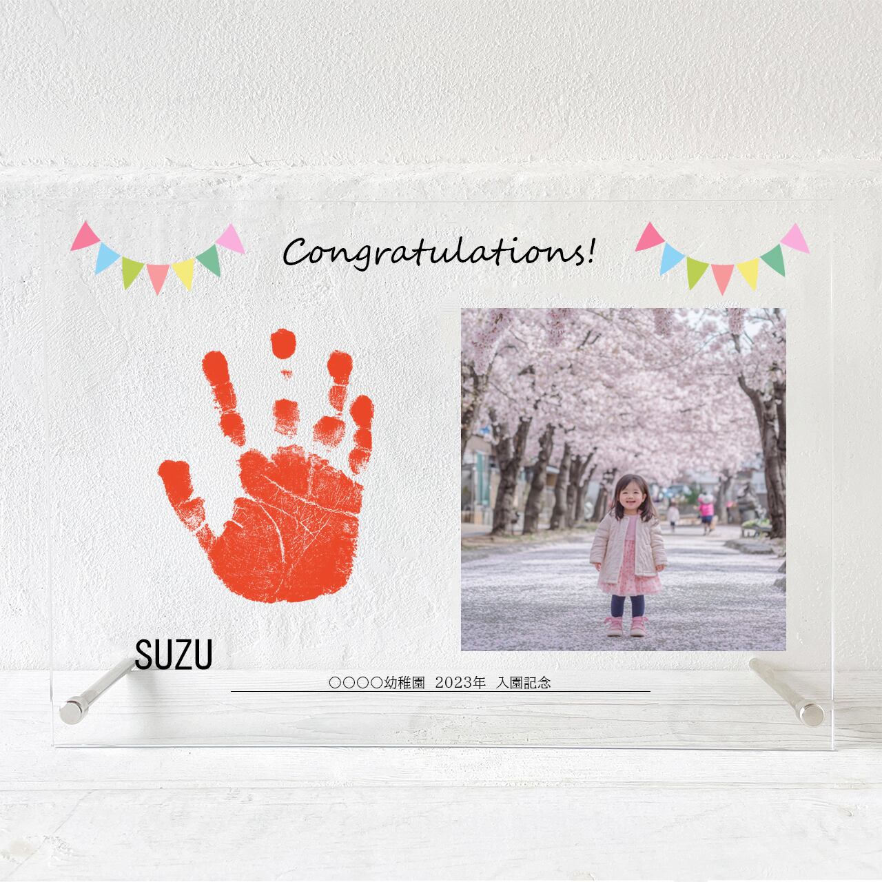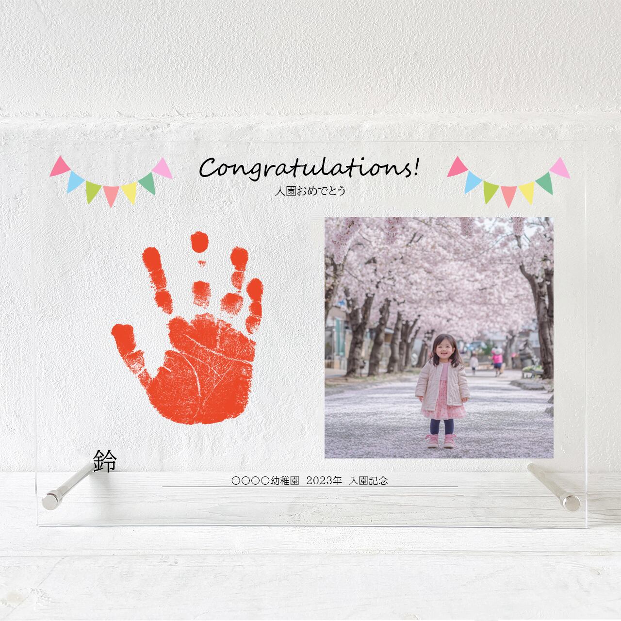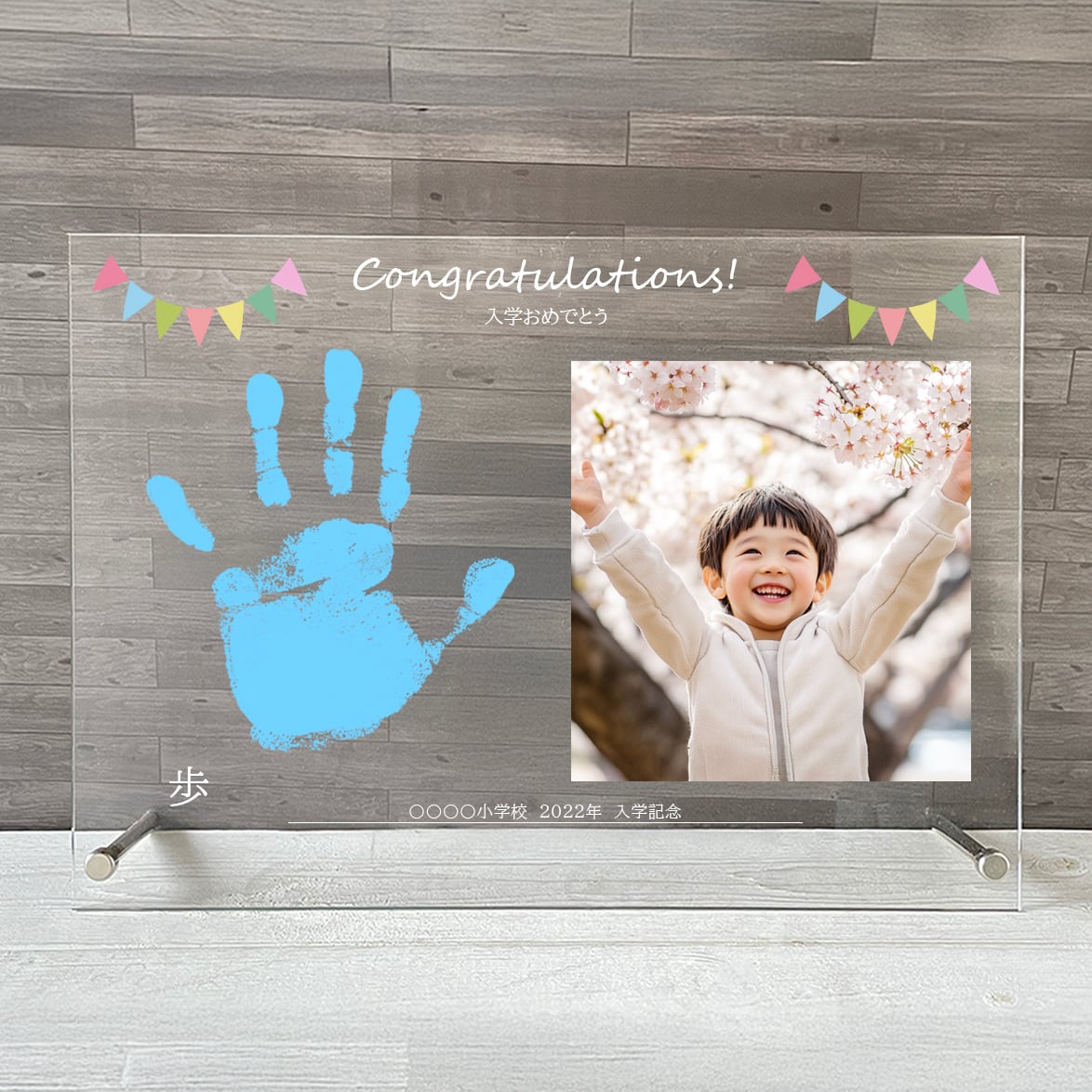 〈NA4S01h〉写真付!こども手形(背景色クリア)【入園、入学記念などにおすすめ!】アクリルフォトスタンドA4 hata(手形横幅13cm前後まで)