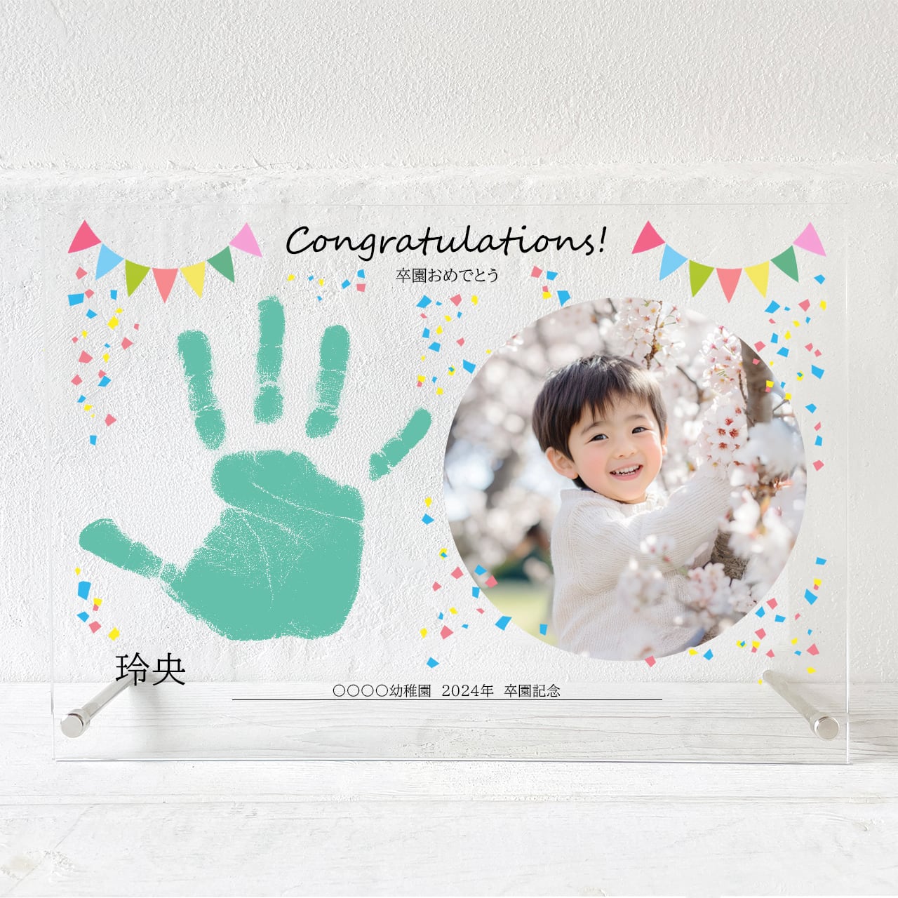 〈SA4S01k〉写真付!こども手形(背景色クリア)【卒園記念などにおすすめ!】アクリルフォトスタンドA4 kamifubuki(手形横幅13cm前後まで)